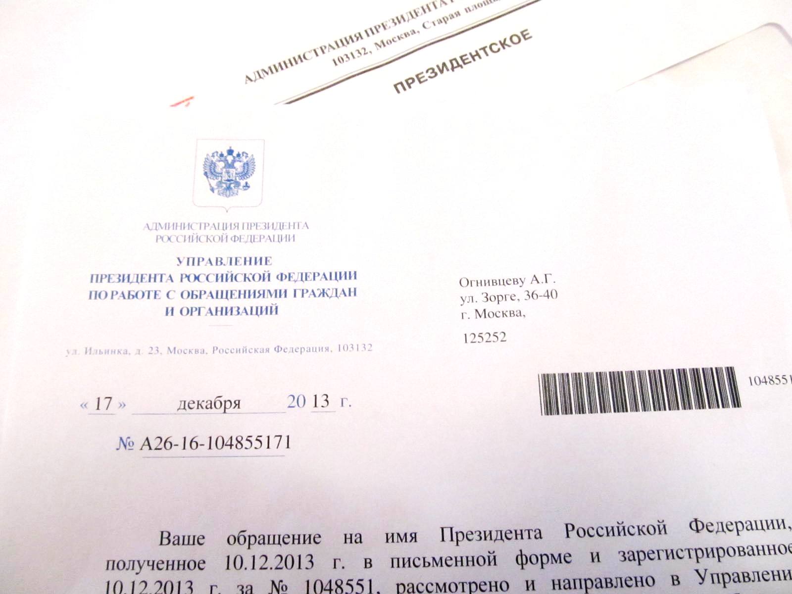 Администрации Президента РФ А.Г.Огнивцеву. Предложение рассмотрено!